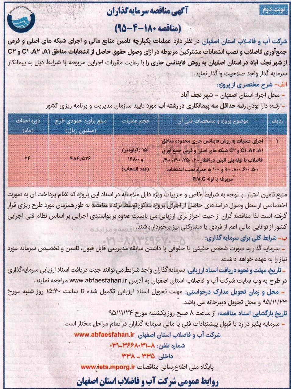 شرکت آب و فاضلاب استان اصفهان در نظر دارد عملیات یکپارچه تامین منابع مالی و اجرای شبکه های اصلی و فرعی جمع آوری فاضلاب و نصب انشعابات مشترکین مربوطه در ازای وصول حقوق حاصل از انشعابات مناطق a1 , a2 c1 , c2 از شهر نجف آباد در استان اصفهان به روش فاینانس جاری را با رعایت مقررات اجرایی مربوطه با شرایط ذیل به پیمانکار سرمایه گذار واجد صلاحیت واگذار نماید