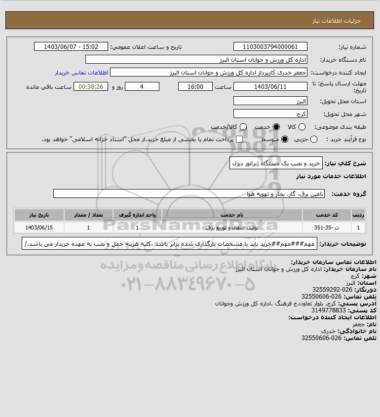 شرح کلی نیاز: خرید و نصب یک دستگاه ژنراتور دیزل