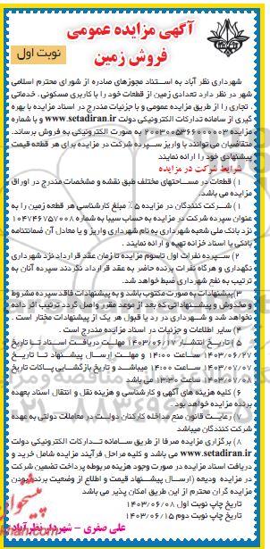 شهرداری نظرآباد در نظر دارد تعدادی زمین از قطعات خود را با کاربری مسکونی، خدماتی ، تجاری را از طریق مزایده عمومی با شماره مزایده 2003005366000003 به صورت الکترونیکی به فروش برساند.