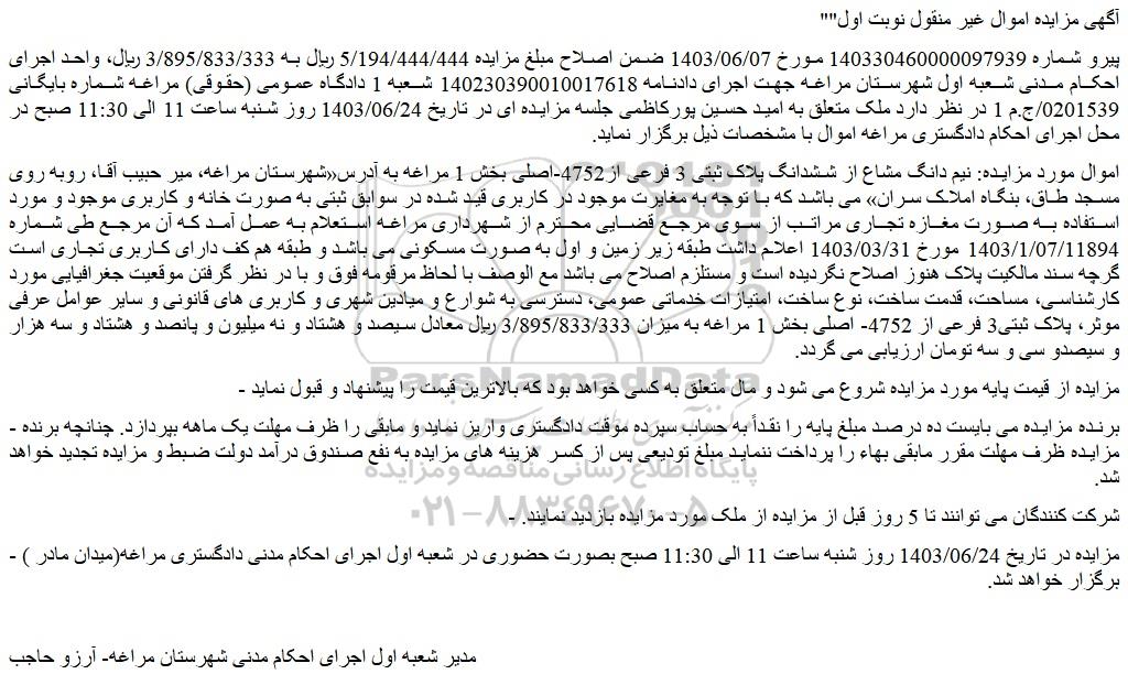 - مزایده در تاریخ 1403/06/24 روز شنبه ساعت 11 الی 11:30 صبح بصورت حضوری در شعبه اول اجرای احکام مدنی دادگستری مراغه(میدان مادر ) برگزار خواهد شد.