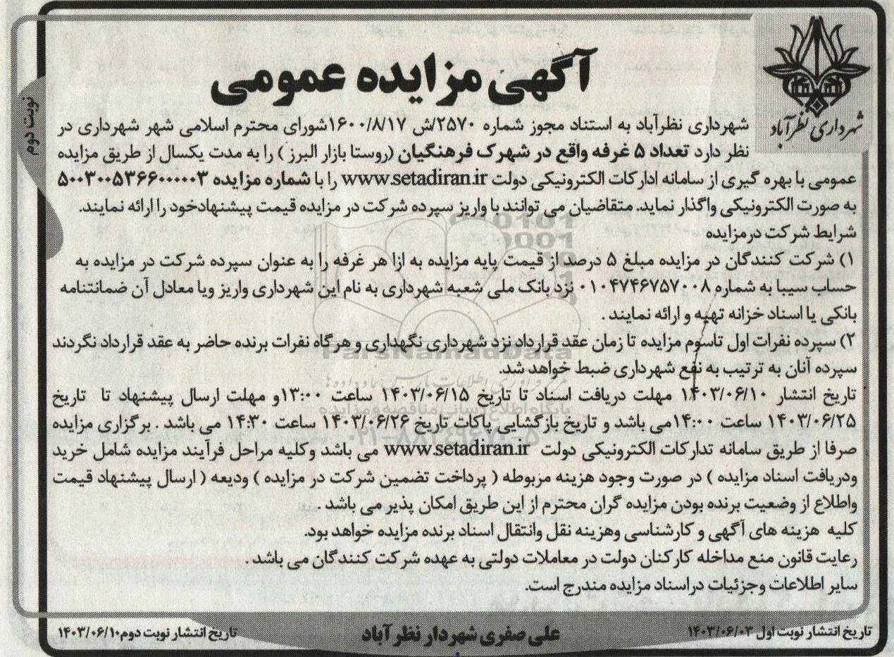 شهرداری نظرآباد به استناد مجوز شماره 2570/ش 1400.08.17 شورای محترم اسلامی شهر نظرآباد در نظر دارد تعداد 5 غرفه واقع در شهرک فرهنگیان (روستا بازار البرز) را به مدت یک سال از طریق مزایده عمومی با بهره گیری از سامانه تدارک الکترونیکی دولت و با شماره مزایده 5003005366000003 به صورت الکترونیکی واگذار نماید . متقاضیان می توانند با واریز سپرده شرکت در مزایده قیمت پیشنهادی خود را ارائه نمایند.