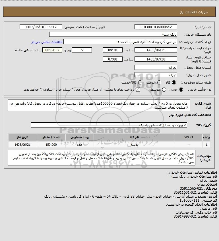 شرح کلی نیاز: زمان تحویل در 5 روز / پوشه ساده در چهار رنگ/تعداد 150000عدد/مطابق فایل پیوست/جریمه دیرکرد در تحویل کالا برای هر روز 7 میلیون تومان میباشد.