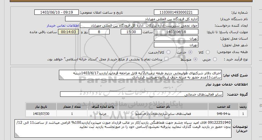 شرح کلی نیاز: اجرای دفاتر شرکتهای هواپیمایی درنیم طبقه ترمینال2/به فایل مراجعه فرمایید/بازدید1403/6/17شنبه ساعت11عدم حضور به منزله حذف از رقابت میباشد قراردادی