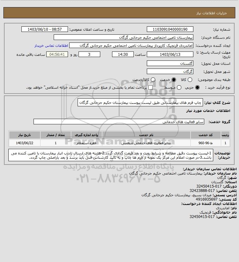 شرح کلی نیاز: چاپ فرم های بیمارستانی طبق لیست پیوست بیمارستان حکیم جرجانی گرگان