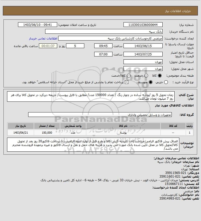 شرح کلی نیاز: زمان تحویل 5 روز /پوشه ساده در چهار رنگ / تعداد 150000 عدد/ مطابق با فایل پیوست/ جریمه دیرکرد در تحویل کالا برای هر روز 7 میلیون تومان میباشد