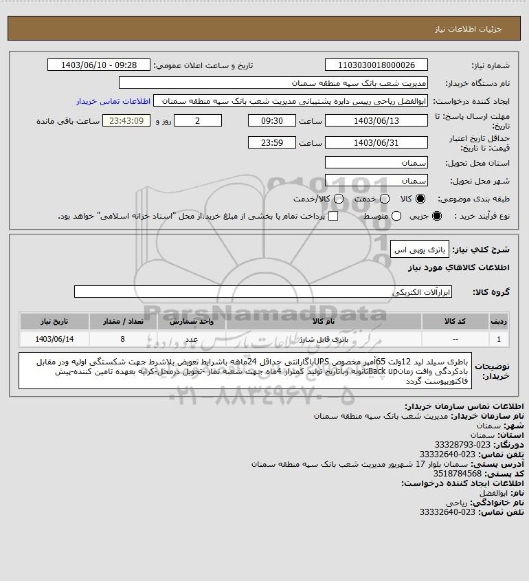 نام دستگاه خریدار:مدیریت شعب بانک سپه منطقه سمنان