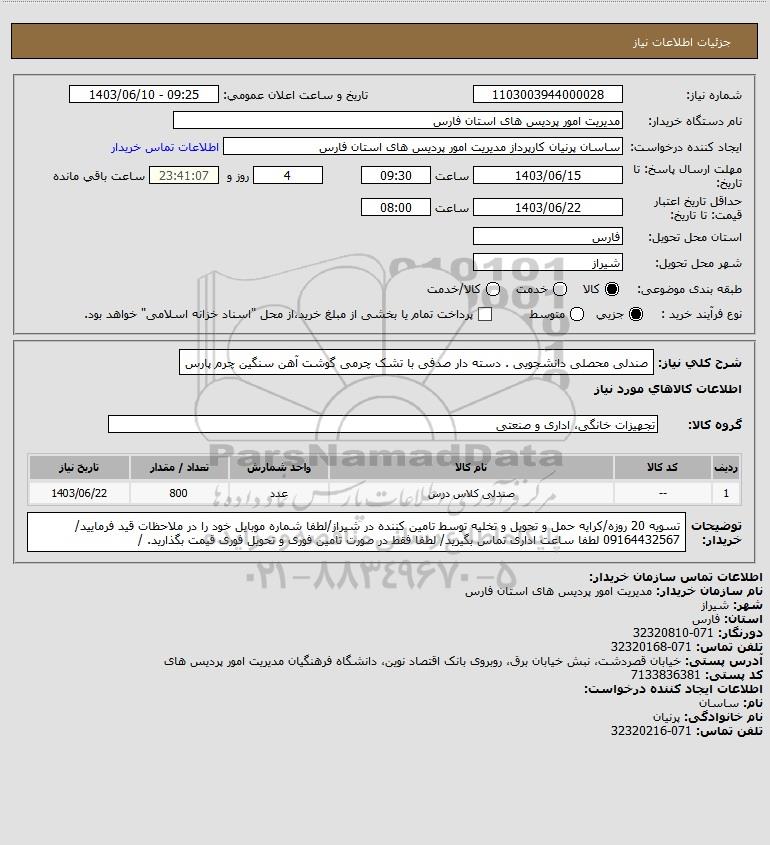 | 1 | -- | صندلی کلاس درس | عدد | 800 | 1403/06/22 |