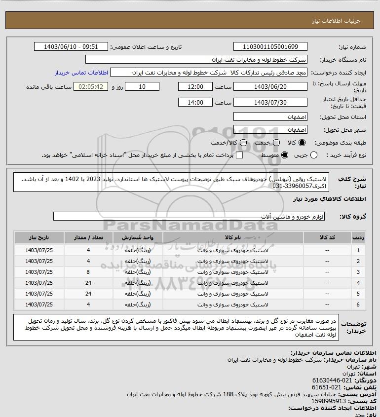 | 6 | -- | لاستیک خودروی سواری و وانت | (رینگ)حلقه | 4 | 1403/07/25 |