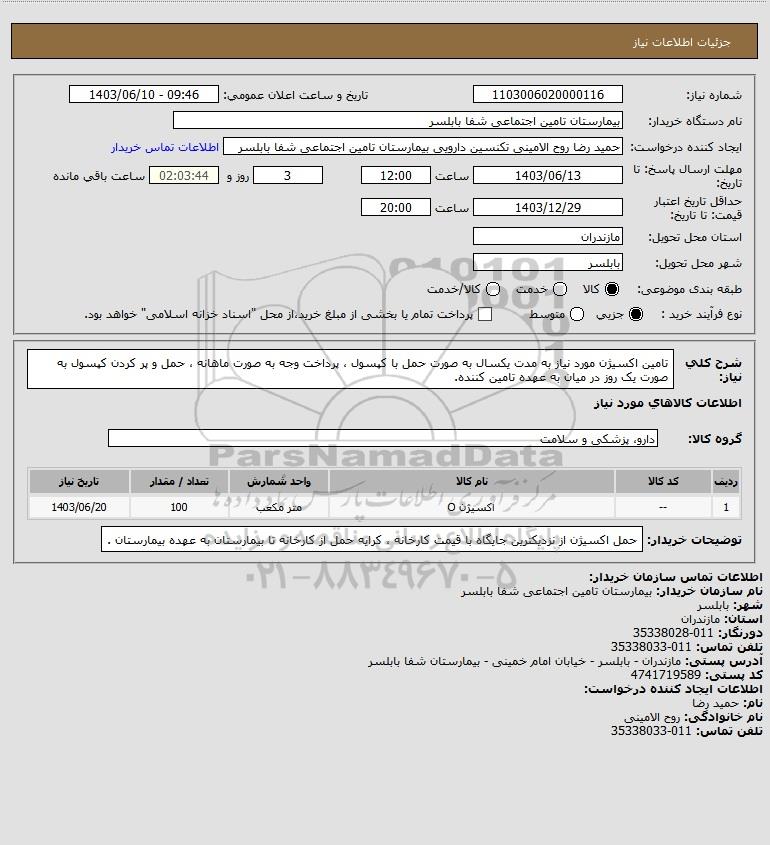 شرح کلی نیاز: تامین اکسیژن مورد نیاز به مدت یکسال به صورت حمل با کپسول ، پرداخت وجه به صورت ماهانه ، حمل و پر کردن کپسول به صورت یک روز در میان به عهده تامین کننده.