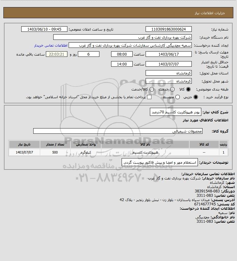 | 1 | -- | هیپوکلریت کلسیم | کیلوگرم | 500 | 1403/07/07 |