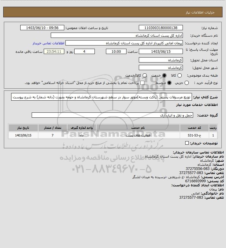 شرح کلی نیاز: توزیع مرسولات پستی (پاکت وبسته)موتور سوار در سطح شهرستان کرمانشاه و حومه بصورت (دانه شمار) به شرح پیوست