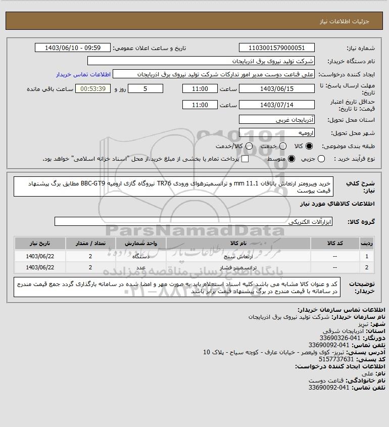 شرح کلی نیاز: خرید ویبرومتر ارتعاش یاتاقان 11.1 mm و ترانسمیترهوای ورودی TR76 نیروگاه گازی ارومیه BBC-GT9 مطابق برگ پیشنهاد قیمت پیوست