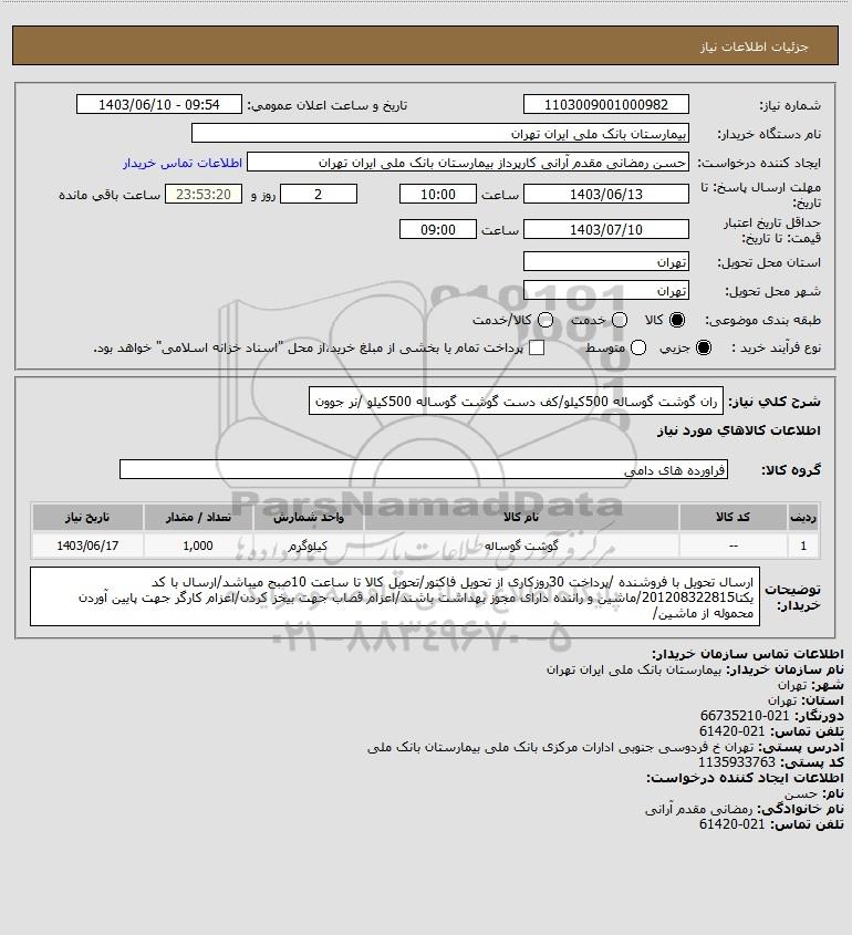 شرح کلی نیاز: ران گوشت گوساله 500کیلو/کف دست گوشت گوساله 500کیلو /نر جوون