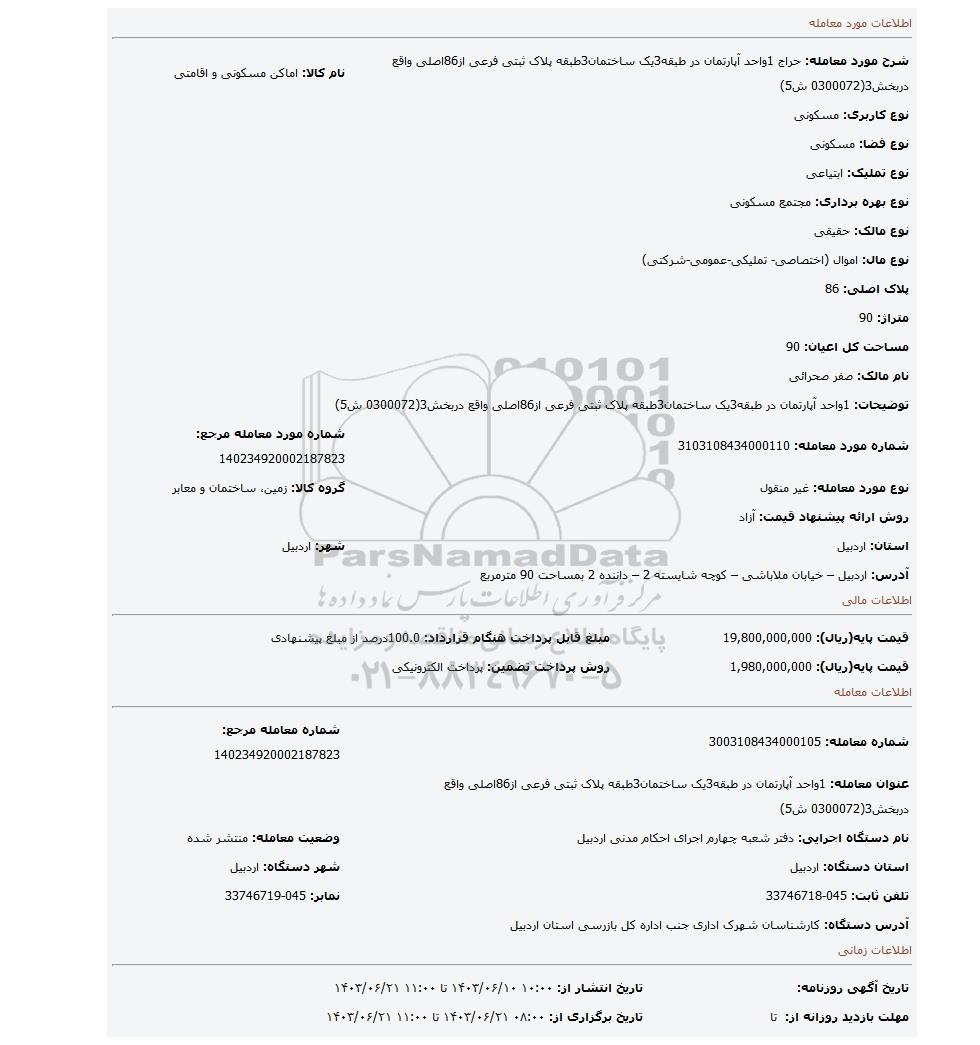 شرح مورد معامله: حراج 1واحد آپارتمان در طبقه3یک ساختمان3طبقه پلاک ثبتی فرعی از86اصلی واقع دربخش3(0300072 ش5) | نام کالا: اماکن مسکونی و اقامتی | |