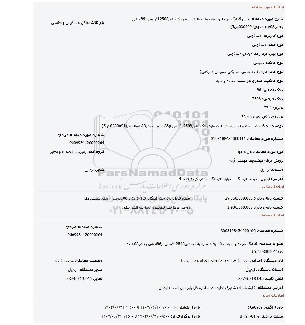 شرح مورد معامله: حراج 6دانگ عرصه و اعیان ملک به شماره پلاک ثبتی12508فرعی از86اصلی بخش03طبقه دوم(0300094ش5) | نام کالا: اماکن مسکونی و اقامتی | |