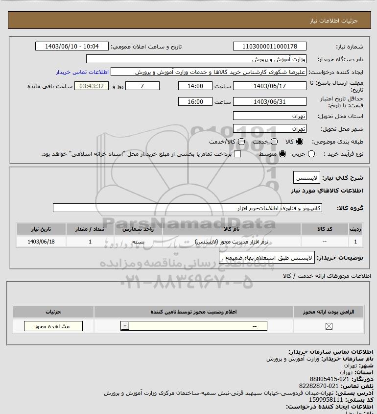 | 1 | -- | نرم افزار مدیریت مجوز (لایسنس) | بسته | 1 | 1403/06/18 |