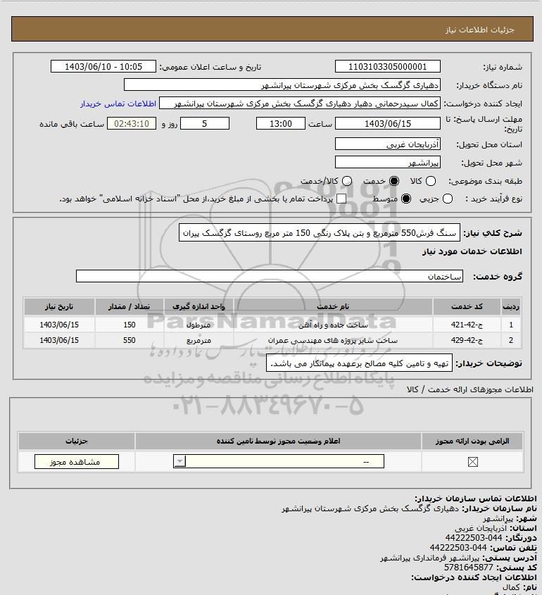 شرح کلی نیاز: سنگ فرش550 مترمربع و بتن پلاک رنگی 150 متر مربع روستای گزگسک پیران