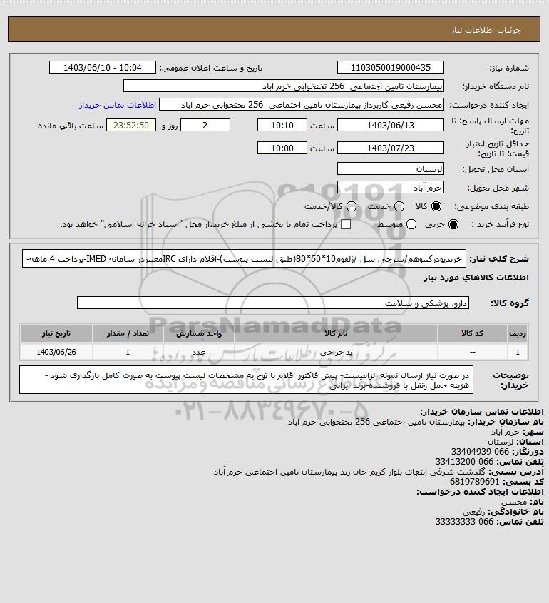 شرح کلی نیاز: خریدپودرکیتوهم/سرجی سل /ژلفوم10*50*80(طبق لیست پیوست)-اقلام دارای IRCمعتبردر سامانه IMED-پرداخت 4 ماهه-