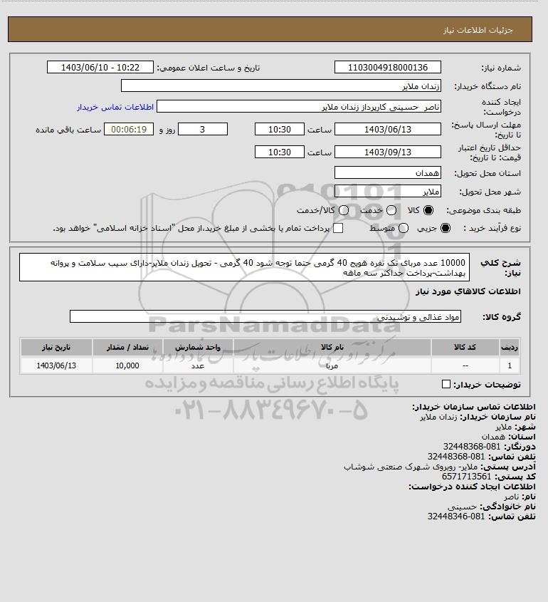 شرح کلی نیاز: 10000 عدد مربای تک نفره هویج 40 گرمی حتما توجه شود 40 گرمی - تحویل زندان ملایر-دارای سیب سلامت و پروانه بهداشت-پرداخت حداکثر سه ماهه
