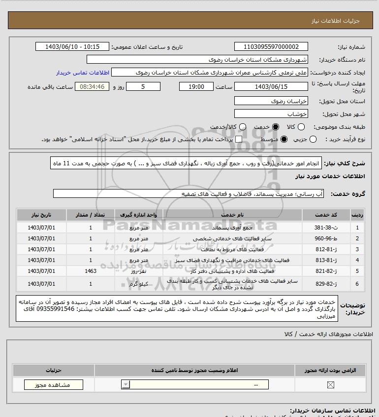 شرح کلی نیاز: انجام امور خدماتی(رفت و روب ، جمع آوری زباله ، نگهداری فضای سبز و ... ) به صورت حجمی به مدت 11 ماه