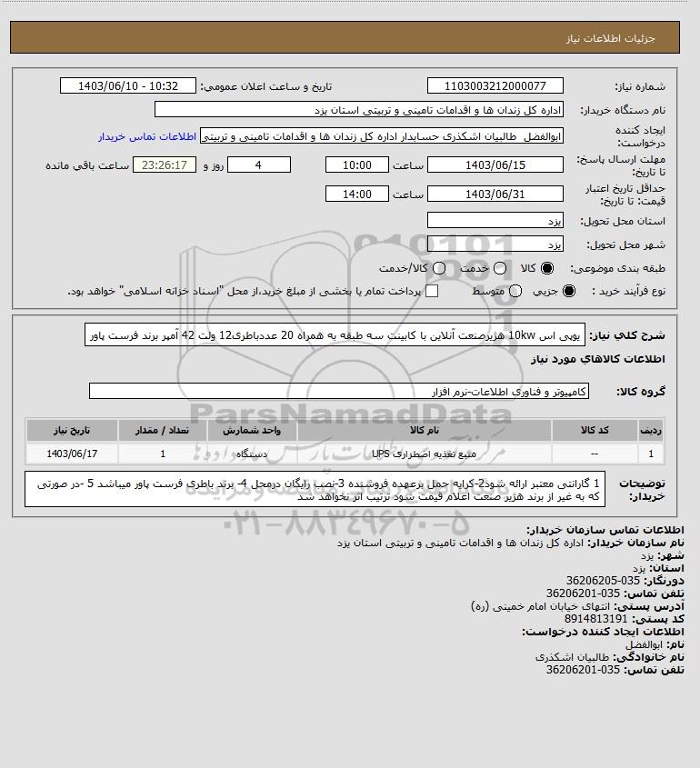شرح کلی نیاز: یوپی اس 10kw هژیرصنعت آنلاین با کابینت سه طبقه به همراه 20 عددباطری12 ولت 42 آمپر برند فرست پاور