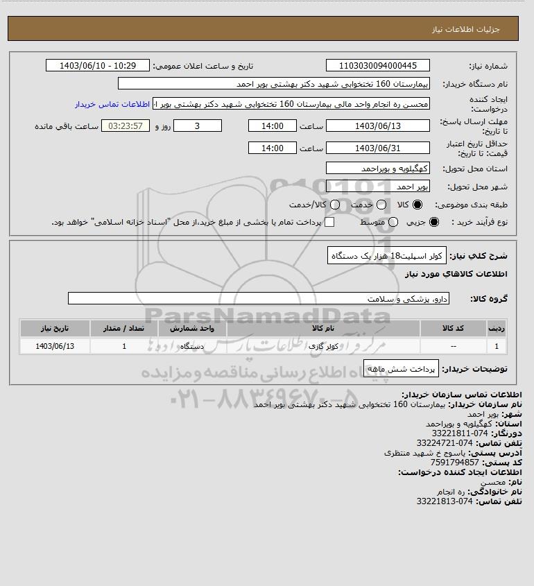 شرح کلی نیاز: کولر اسپلیت18 هزار یک دستگاه