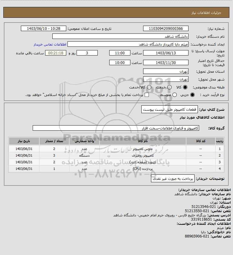 شرح کلی نیاز: قطعات کامپیوتر طبق لیست پیوست