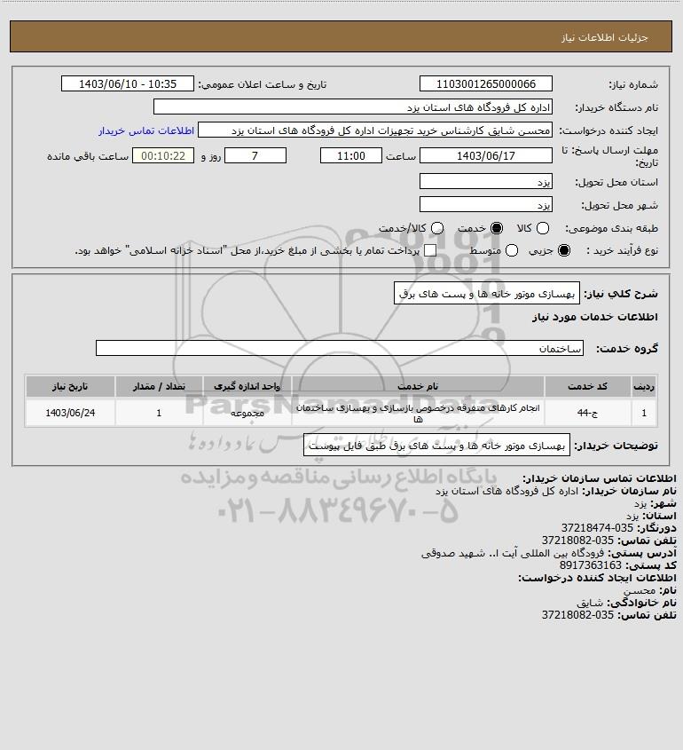 توضیحات خریدار:بهسازی موتور خانه ها و پست های برق طبق فایل پیوست