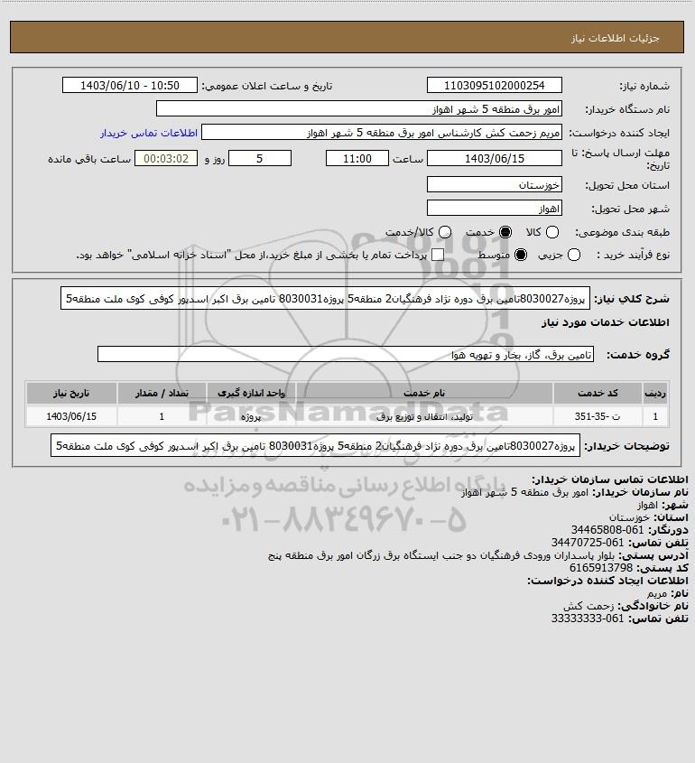 نام دستگاه خریدار:امور برق منطقه 5 شهر اهواز