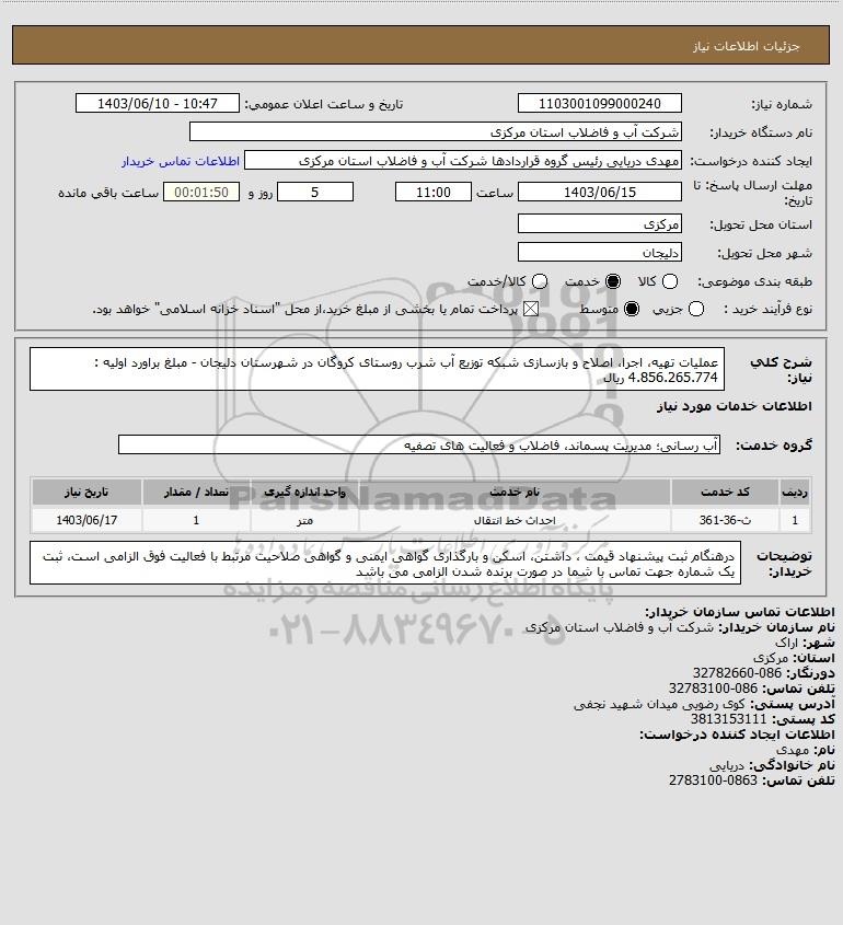 شرح کلی نیاز: عملیات تهیه، اجرا، اصلاح و بازسازی شبکه توزیع آب شرب روستای کروگان در شهرستان دلیجان - مبلغ براورد اولیه : 4.856.265.774 ریال