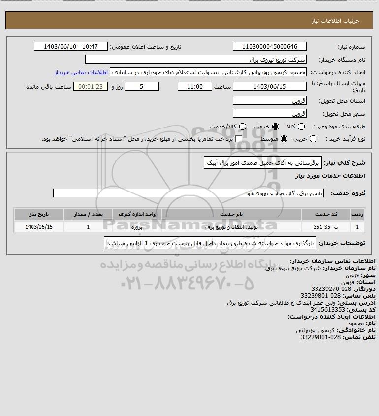 استعلام برقرسانی به آقای جمیل صمدی امور برق آبیک, استعلام برقرسانی به آقای جمیل صمدی امور برق آبیک