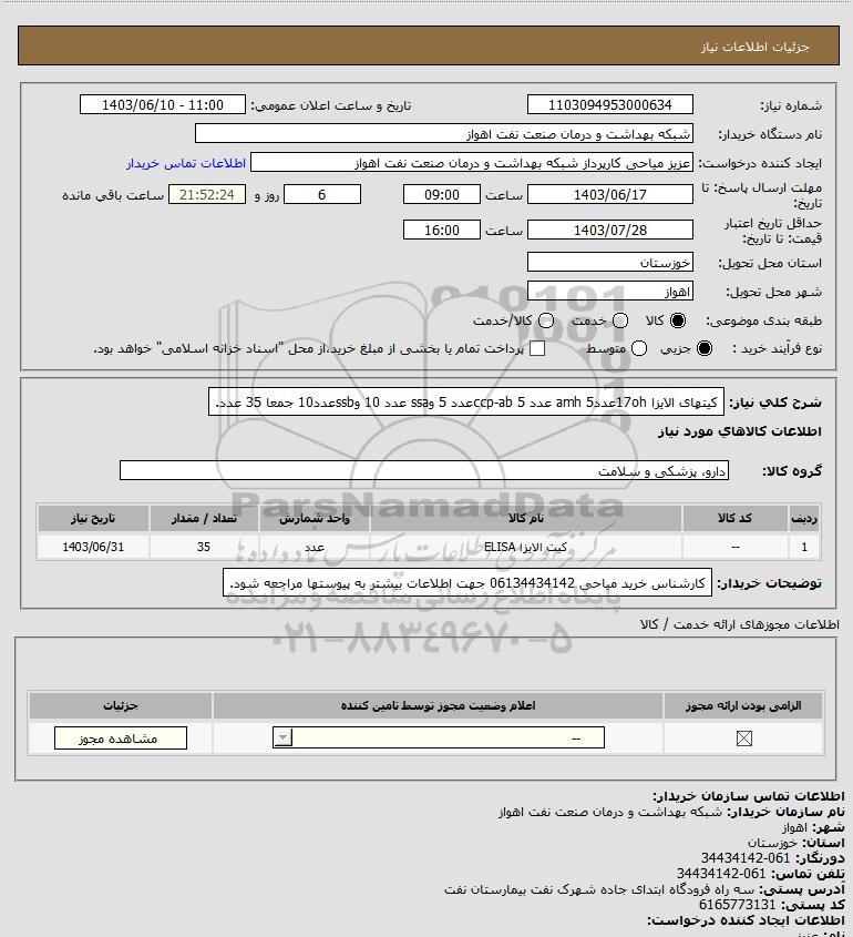 | 1 | -- | کیت الایزا ELISA | عدد | 35 | 1403/06/31 |