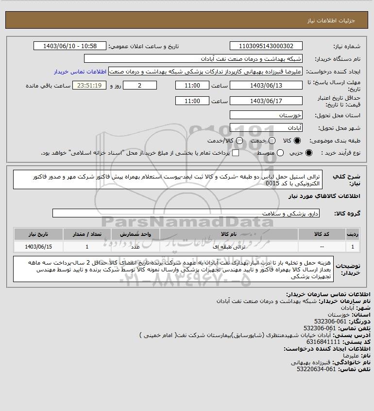 شرح کلی نیاز: ترالی استیل حمل لباس دو طبقه -شرکت و کالا ثبت ایمد-پیوست استعلام بهمراه پیش فاکتور شرکت مهر و صدور فاکتور الکترونیکی با کد 0015