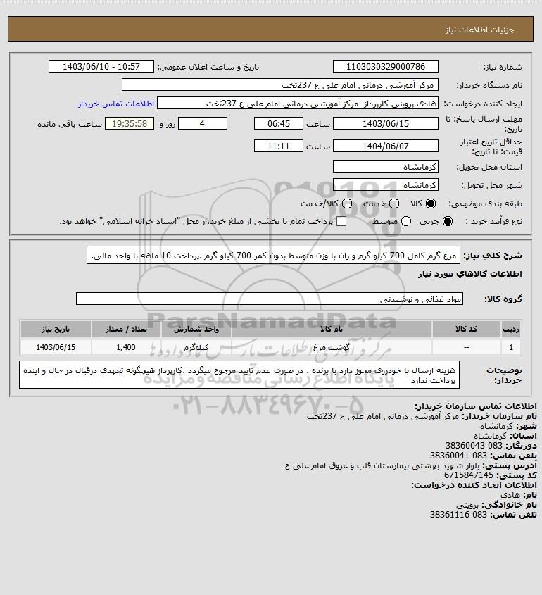 شرح کلی نیاز: مرغ گرم کامل 700 کیلو گرم و ران با وزن متوسط بدون کمر 700 کیلو گرم .پرداخت 10 ماهه با واحد مالی.