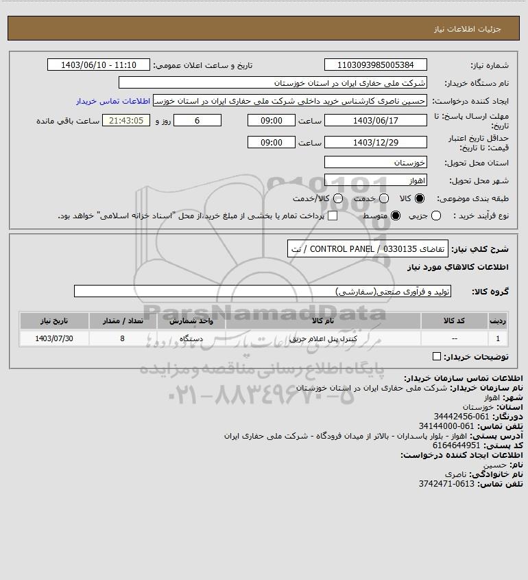 شرح کلی نیاز: تقاضای 0330135 / CONTROL PANEL / نت