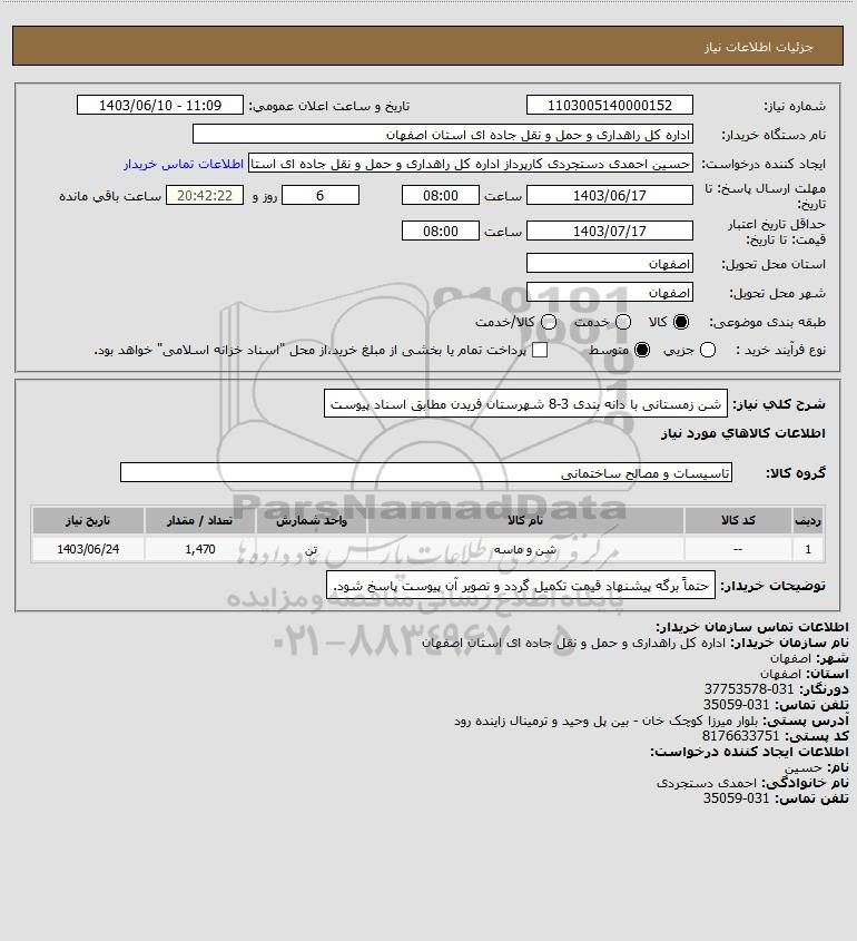 شرح کلی نیاز: شن زمستانی با دانه بندی 3-8 شهرستان فریدن مطابق اسناد پیوست