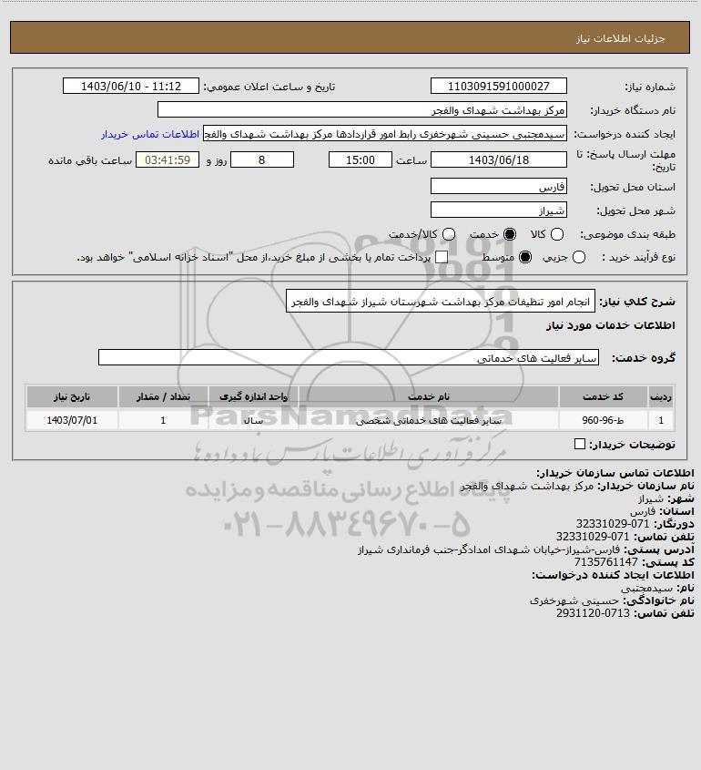 شرح کلی نیاز: انجام امور تنظیفات مرکز بهداشت شهرستان شیراز شهدای والفجر