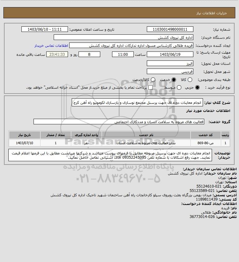 شرح کلی نیاز: انجام معاینات دوره ای جهت پرسنل مجتمع نوسازی و بازسازی لکوموتیو راه آهن کرج