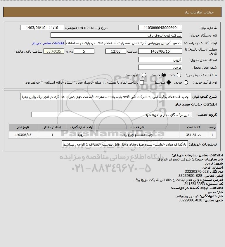 استعلام تجدید استعلام برقرسانی به شرکت افق قلعه پارسیان دستمزدی قسمت دوم بصورت خط گرم در امور برق بوئین زهرا, استعلام تجدید استعلام برقرسانی به شرکت افق قلعه پارسیان دستمزدی قسمت دوم بصورت خط گرم در امور برق بوئین زهرا