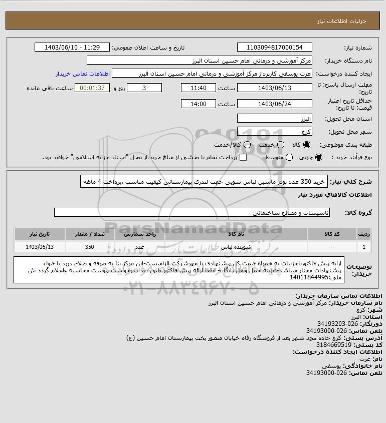 شرح کلی نیاز: خرید 350 عدد پودر ماشین لباس شویی جهت لندری بیمارستانی کیفیت مناسب ،پرداخت 4 ماهه