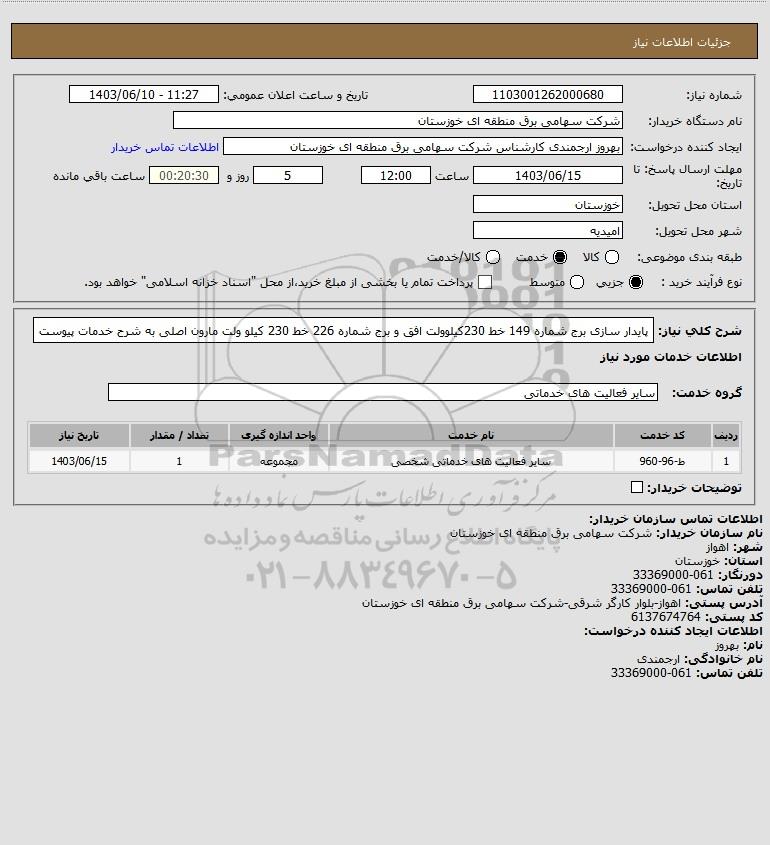 شرح کلی نیاز: پایدار سازی برج شماره 149 خط 230کیلوولت افق و برج شماره 226 خط 230 کیلو ولت مارون اصلی به شرح خدمات پیوست