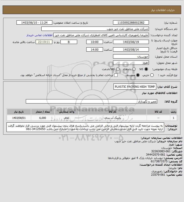 شرح کلی نیاز: PLASTIC PACKING HIGH TEMP