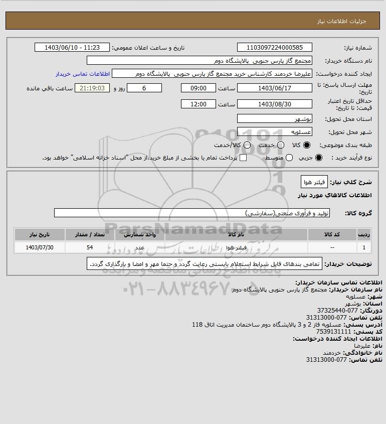 نام دستگاه خریدار:مجتمع گاز پارس جنوبی پالایشگاه دوم