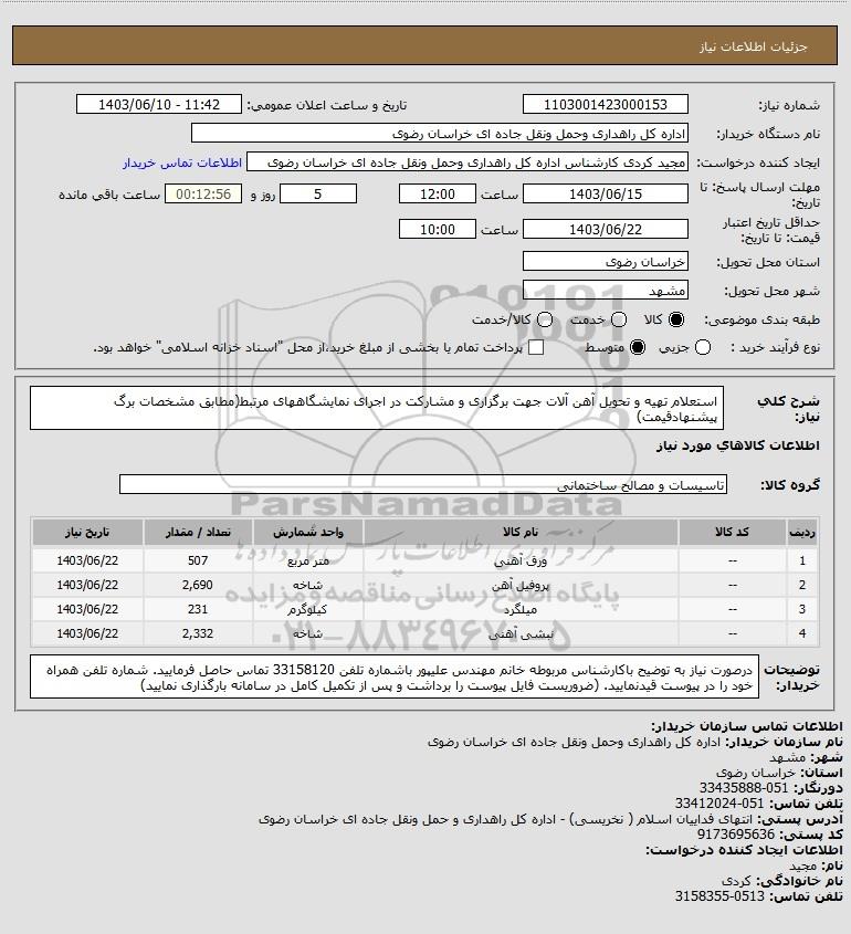 شرح کلی نیاز: استعلام تهیه و تحویل آهن آلات جهت برگزاری و مشارکت در اجرای نمایشگاههای مرتبط(مطابق مشخصات برگ پیشنهادقیمت)
