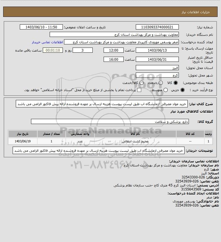 نام دستگاه خریدار:معاونت بهداشت و مرکز بهداشت استان کرج