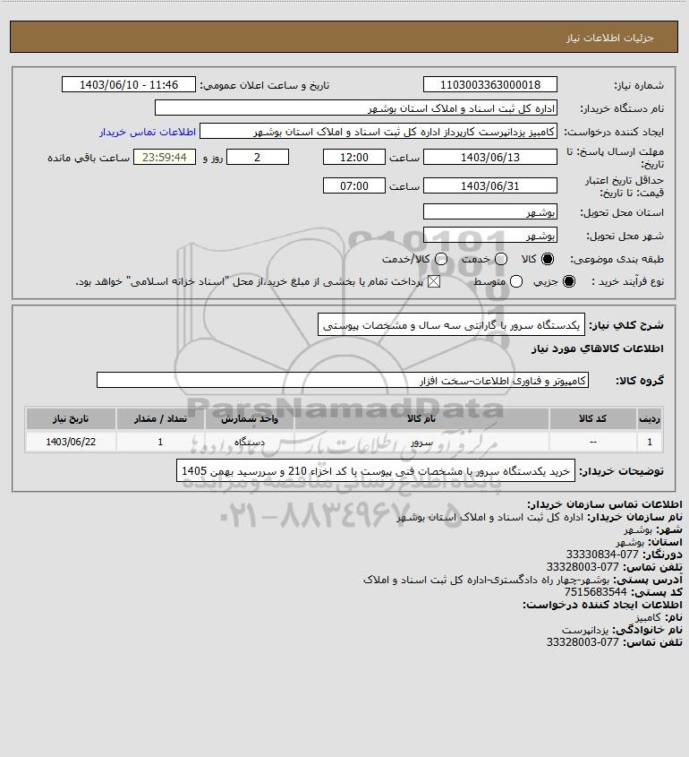 توضیحات خریدار:خرید یکدستگاه سرور با مشخصات فنی پیوست با کد اخزاء 210 و سررسید بهمن 1405
