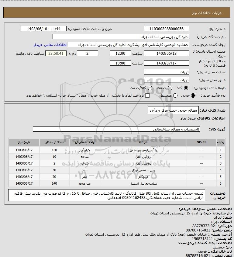 شرح کلی نیاز: مصالح جزیی جهت مرکز وردآورد