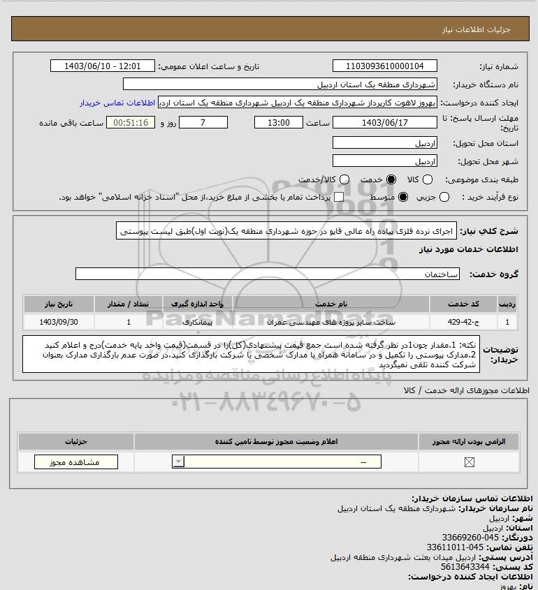 استعلام بها و موضوع استعلام استعلام اجرای نرده فلزی پیاده راه عالی قاپو در حوزه شهرداری منطقه یک(نوبت اول)طبق لیست پیوستی به اطلاع کلیه شرکت‌ها و افراد متخصص واجد شرایط می‌رساند، آگهی گذار در نظر دارد از طریق استعلام بها، نسبت به انتخاب و دریافت پیشنهادات اقدام نماید. این استعلام با کد آگهی ثبت شده در سامانه خبرگزاری پارس نماد : 7942022 منتشر شده است. مشخصات استعلام : تاریخ شروع استعلام: 1403/06/10 آخرین مهلت ارسال پیشنهاد قیمت : 1403/06/17 و محل اجرای پروژه : استان اردبیل میباشد. استعلام قیمت مورد درخواست : استعلام اجرای نرده فلزی پیاده راه عالی قاپو در حوزه شهرداری منطقه یک(نوبت اول)طبق لیست پیوستی با دسته‌بندی‌های تخصصی و گروه های مرتبط : سازه های فلزی و فضایی, ساختمان, استعلام اطلاع رسانی میگردد.