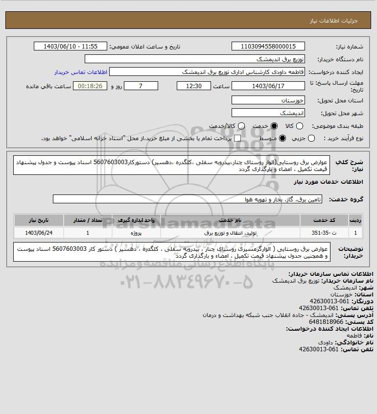شرح کلی نیاز: عوارض برق روستایی(الوار روستای چنار،بیدروبه سفلی ،کلگدره ،دهسیر) دستورکار5607603003