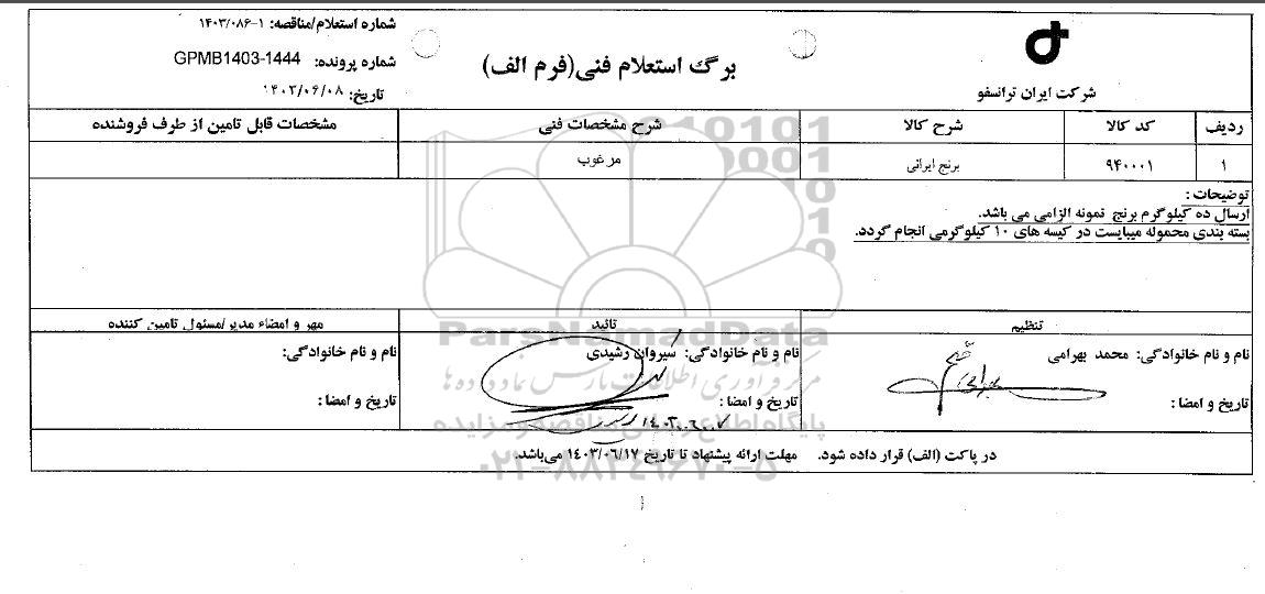 برگ استعلام بها (فرم الف)